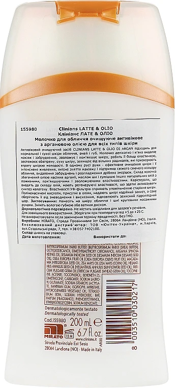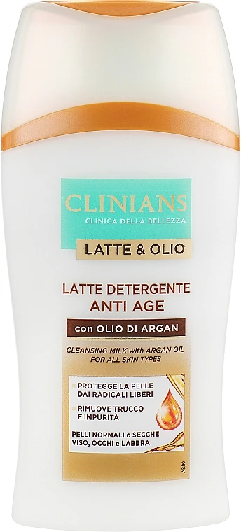 Die Anti-Aging-Gesichtsreinigungsmilch mit Arganöl für normale und trockene Haut von Clinians reinigt Ihre Haut besonders mild. Das Produkt beinhaltet hochwertiges Arganöl, das aus Marokko kommt. Das Öl lässt die Haut nicht nur weich und geschmeidig werden, sondern wirkt auch gegen die Hautalterung. Zudem bekämpft es Akne und Entzündungen und glättet Falten und Fältchen. Die Milch lässt sich sehr einfach auf der Haut verteilen und beseitigt Make-up, Schmutz und Unreinheiten sofort. Das Produkt ist auch für sensible Haut geeignet und begeistert mit einem sehr angenehmen Duft.