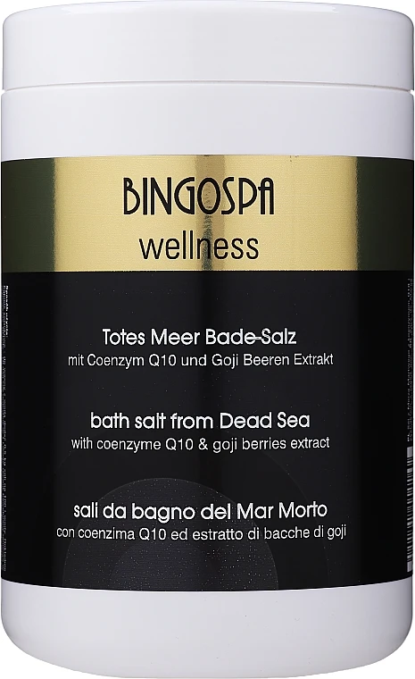 Das BingoSpa Salt For Bath SPA of Dead Sea ist ein reichhaltiges Badesalz aus dem Toten Meer, das mit Coenzym Q10 und Goji-Beeren-Extrakt für Begeisterung sorgt. Das Produkt wirkt entgiftend und sorgt dafür, dass sich die Haut wieder glättet und straffer wird. Nach einem Bad fühlt sich die Haut sofort seidig und weich an und ist mit viel Feuchtigkeit versorgt. Zudem bessern sich auch Unreinheiten und Akne mit der Zeit, wenn die Bäder regelmäßig erfolgen. Das Badesalz sorgt für eine frische und jugendliche Haut und kann täglich genutzt werden. Eine guter Ratschlag ist es, das Salz wöchentlich zu verwenden, um die Haut intensiv zu pflegen.
