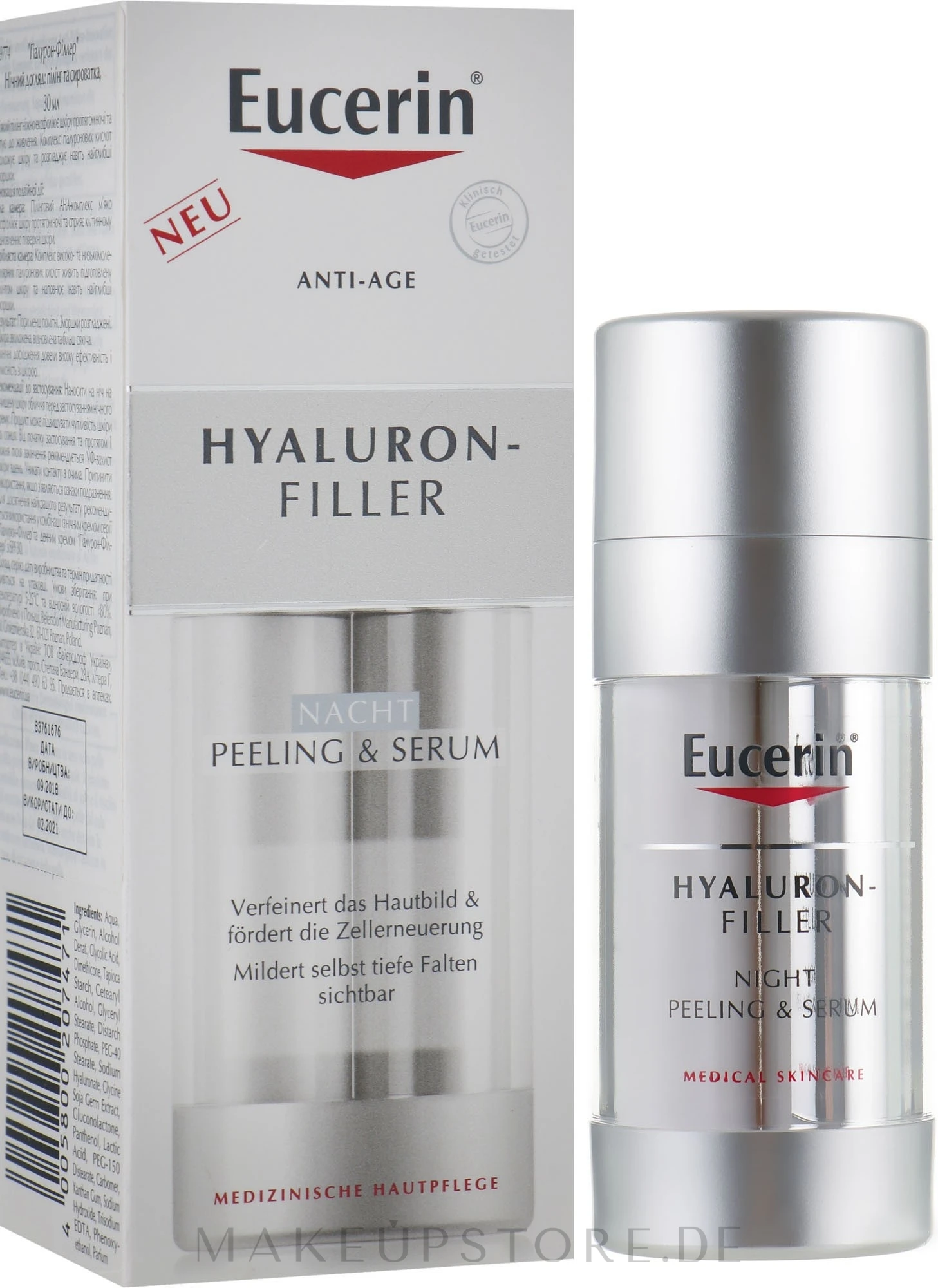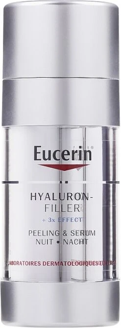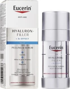 Das regenerierende Peeling-Serum für die Nacht mit Hyaluronsäure von Eucerin ist ein wahres Doppelwunder für die Jugendlichkeit Ihrer Haut! Dieses Produkt entfernt sanft abgestorbene Hautzellen für eine aktive Hauterneuerung und sorgt für intensive Feuchtigkeitsversorgung, damit Ihre Haut straff, weich und gesund strahlt. Bereits nach der ersten Anwendung werden feine und tiefe Falten gemildert und weniger sichtbar. Das Serum hat eine nicht komedogene Formel und wurde von Dermatologen getestet.