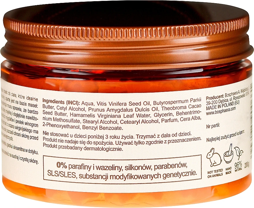 Die feuchtigkeitsspendende und regenerierende Körperbutter mit Beeren- und Feigenduft von Bosphaera lässt Ihre Haut wieder zart und geschmeidig werden. Das Produkt unterstützt die Haut bei der Regeneration und sorgt dafür, dass diese weich und samtig wird. Die Haut fühlt sich erholt und angenehme entspannt an und erhält einen zarten Duft nach Beeren und Feigen. Verwenden Sie das Produkt, das langanhaltende Feuchtigkeit verspricht, unbedingt regelmäßig, um die Haut intensiv zu pflegen. Setzen Sie dabei auf nährende Inhaltsstoffe, die dafür sorgen, dass die Haut wieder jugendlicher und samtiger wirkt.