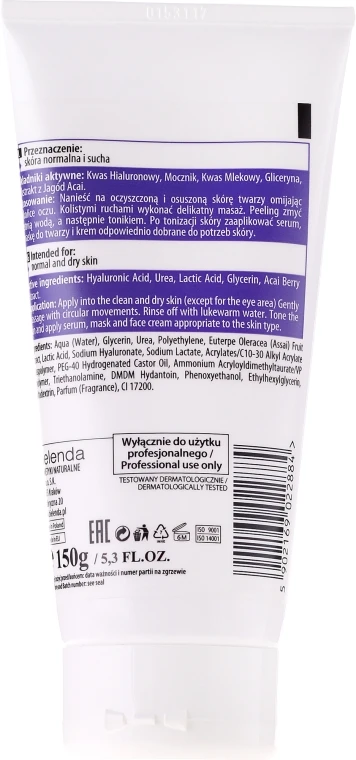 Zur täglichen Gesichtspflege sollten nicht nur der Make-up Entferner oder verschiedene Cremes gehören, sondern sollte man auch ein Produkt für die Regeneration der Epidermis verwenden. Dieses Gesichtspeeling von Bielenda ist die perfekte Pflege für eine frei von Irritationen Haut. Dank dem Gehalt an Hyaluronsäuren wird sie gestrafft und geglättet. Der Acai-Beeren Extrakt trägt zur Sauberkeit, Glättung und zu einem gesünderen Look. Nach regelmäßiger Anwendung wird sie spürbar weicher und geschmeidiger, während Entzündungen beseitigt werden. Die Alterung der Haut wird verlangsamt, die Falten werden aufgefüllt und das Gesicht einem jüngeren Look verliehen. Verpassen Sie nicht es mit diesem professionellen Peeling regelmäßig zu waschen, um eine reine unde gesunde Haut zu erhalten.