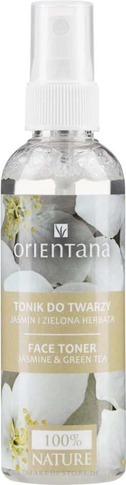Orientana Face Toner Jasmine & Green Tea ist ein Gesichtstonikum mit Jasmin und grünem Tee. Die im Tonikum enthaltenen Wirkstoffe erneuern Ihre Haut und geben Ihr ihren natürlichen pH-Wert zurück. Darüber hinaus bildet es eine Schutzbarriere gegen schädliche äußere Einflüsse, stärkt Ihre Haut, hydralisiert und nährt sie. Das Face Toner Jasmine & Green Tea Gesichtstonikum von Orientana wird mit einer 100 % vegan-freundlichen Formel hergestellt. Das Jasminöl wird aus Indischem Jasmin gewonnen. Es spendet eine tiefgehende Feuchtigkeit, stärkt die Haut und lindert Irritationen. Grüner Tee enthält viele Antioxidantien mit Anti-Aging-Effekt und entgiftenden Eigenschaften. Aloe ist eine Quelle der Jugend mit antioxidativen, feuchtigkeitsspendenden und beruhigenden Eigenschaften sowie entzündungshemmender Wirkung.