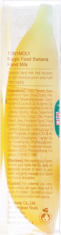 Die Handmilch mit Banane von Tony Moly ist besonders für trockene, raue und rissige Hände zu empfehlen. Kokosöl, Macadamiaöl sowie Sheabutter versorgen die Haut mit Feuchtigkeit. Bananenextrakt und Milchproteine pflegen sie geschmeidig.