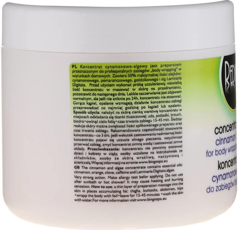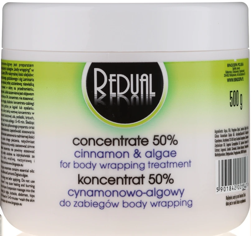 Redual Körperkonzentrat mit 50 % Zimt-Algen-Konzentrat unterstützt das Abnehmen und mildert Cellulite durch Body-Wrapping-Anwendungen für den Heimgebrauch. Natürliche Öle aus Zimt, Orangen und Nelken beschleunigen durch Wärmeentwicklung die Fettverbrennung. Laminaria Digitata Algen entgiften, spenden Feuchtigkeit und regen die Kollagenproduktion an, wodurch sich die Haut glättet. Koffein-Extrakt verstärkt den Effekt.
