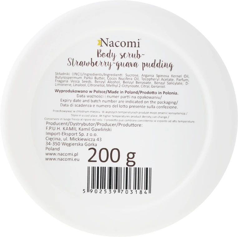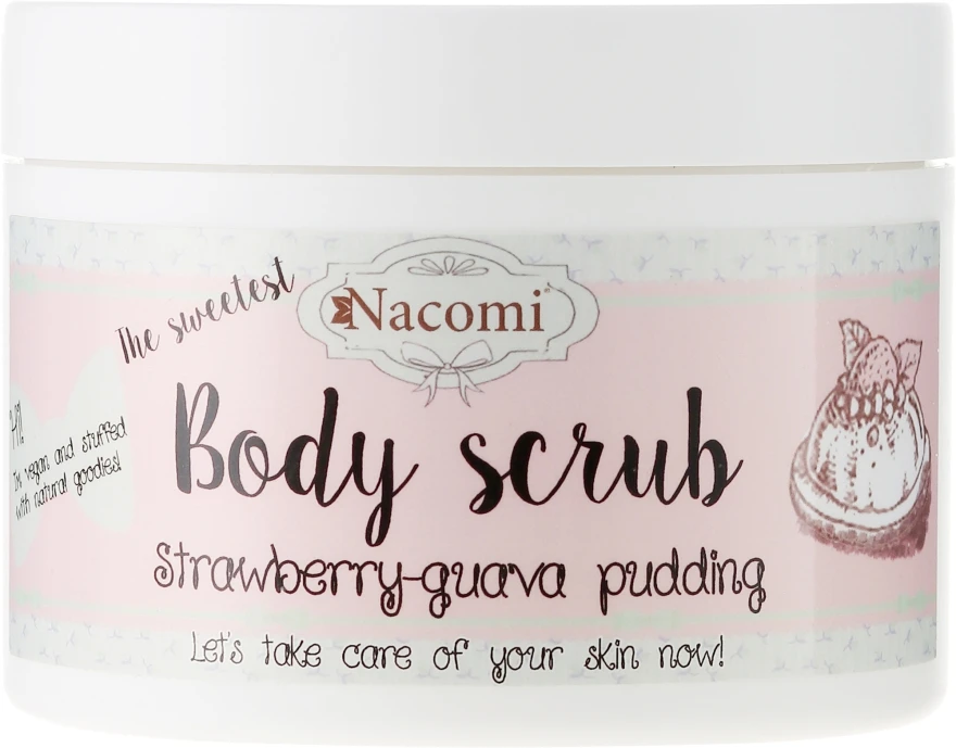 Nacomi Strawberry Guave Pudding Körperpeeling wird empfohlen als Peeling und Feuchtigkeitpflege für alle Hauttypen. Das Körperpeeling enthält Zucker und Erdbeersamen, die sanft peelen und die Haut glätten. Die Sheabutter spendet Feuchtigkeit und regeneriert die Haut. Außerdem verzögert sie den Alterungsprozess der Haut. Das Kokosnussöl stärkt die Schutzfunktion der Haut und macht sie geschmeidig. Zusätzlich spendet das Arganöl der Haut viel Feuchtigkeit und nährt sie. Es stimuliert die Kollagenproduktion und hat Anti-Aging-Eigenschaften. Der angenehme Geruch von Erdbeere und Guave wirkt sehr exotisch, als wäre man im tropischen Paradies!