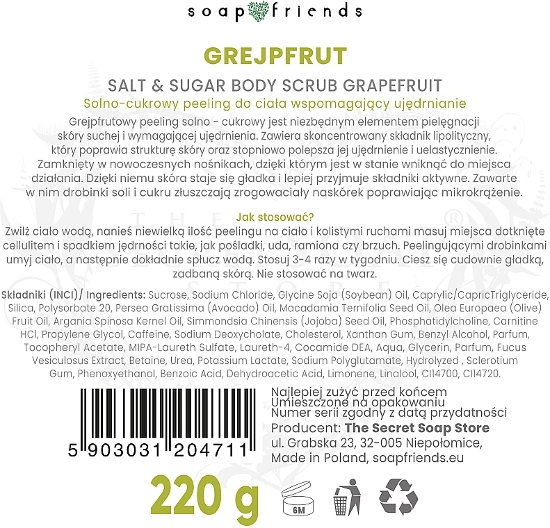 Naturkosmetik der Marke The Secret Soap Store ermöglicht es Ihnen, mit hochwertigen Home-SPA-Produkten die Haut lange jugendlich und gesund zu erhalten. Das Körperpeeling mit Grapefruit strafft und vitalisiert gleichermaßen: Zucker- und Salzkristalle entfernen sanft abgestorbene Partikel, während ein Komplex mit Argan-, Oliven-, Macadamia-, Avocado-, Jojoba und Sojaöl tiefgehend regeneriert. Fucus-Algenextrakt liefert Mineralien und sättigt die Zellen mit Feuchtigkeit, während Koffein die Durchblutung anregt, überschüssiges Zellwasser absorbiert und ermüdetes Gewebe festigt. Vitaminreiches Grapefruit-Extrakt stärkt die Schutzeigenschaften gegen äußere Faktoren und glättet Unebenheiten.