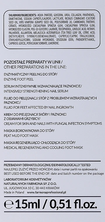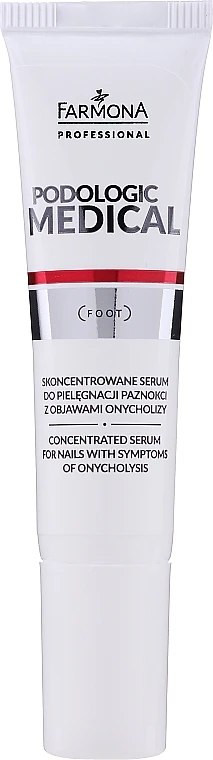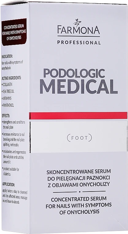 Beim Farmona Professional Podologic Medical Concentrated Serum For Nails With Symptoms Of Onycholysis handelt es sich um ein konzentriertes Serum, das eigens für die Behandlung von Nägeln mit Onycholyse-Symptomen entwickelt wurde. Daher eignet sich das Produkt unter anderem auch für Diabetiker, die unter teilweiser oder kompletter Ablösung sowie Splittern der Nägel leiden. Das Serum pflegt und stärkt die Nagelplatte und erhöht deren Widerstandsfähigkeit gegen Nagelbruch und Spaltung. Es regeneriert intensiv und spendet der Nagelplatte sowie der Nagelhaut intensive Feuchtigkeit. Hierfür enthält das Präparat Teebaumöl, Collagen, Vitamine und Panthenol.