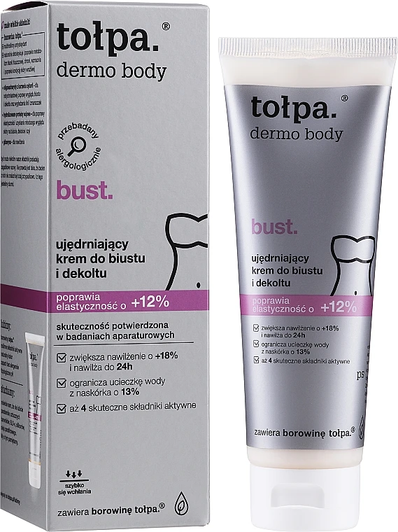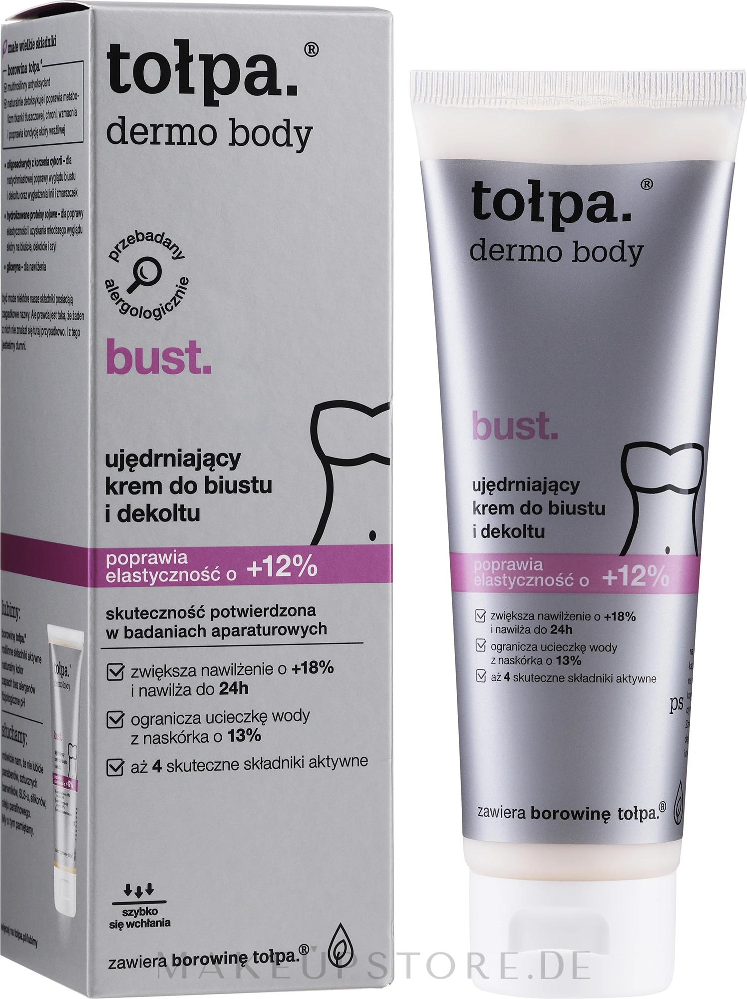 Die modellierende Creme entspricht dem Wunsch vieler Frauen, die über lange Zeit ihre Körperkonturen ins rechte Licht stellen möchten. Mit der Tolpa Brust- und Dekolletécreme verbessert sich die Festigkeit, Elastizität und Ebenmäßigkeit um 10 %, wie ein dermatologischer Test belegt. Pflanzliche Wirkstoffe aus Torf-Extrakt und Zichorienwurzel glätten Falten und erhellen altersbedingte Verfärbungen am Hals, im Ausschnittbereich und an der Brust. Peloid, ein pflanzliches Antioxidans, entgiftet und verbessert den Stoffwechsel. Glycin-Soja-Proteine hydrieren die Haut intensiv, wodurch sich das Aussehen sichtbar verjüngt. Die seidige Cremetextur ist frei von Allergenen, Parabenen, synthetischen Farbstoffen, SLS, Silikonen und Mineralölen.