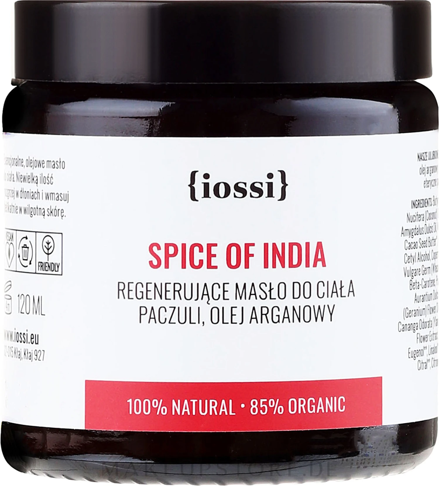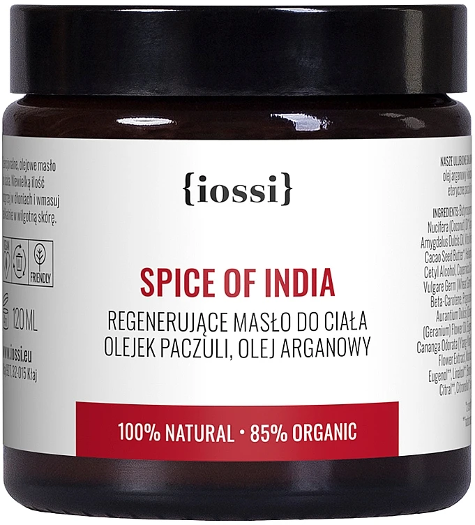 Die reichhaltige Körperbutter Spice of India von Iossi regeneriert die Haut und verwöhnt mit einem aromatischen Duft die Sinne. Würzige und süße Nuancen aus Arganöl, Patschuli, Süßorange, Nelke, Ylang-Ylang und Grapefruit sorgen für eine entspannte Auszeit vom Alltag. Die pflegende Formel ist wasserfrei, komplett natürlich und vegan. Die zarte Körperbutter verwandelt sich durch die Wärme der Haut in ein umhüllendes Öl mit langanhaltender Wirkung. Die Butter bildet einen Schutzfilm auf der Haut, der vor einem erneuten Feuchtigkeitsverlust schützt. Reichhaltige Pflanzenöle wie Sheabutter und Arganöl versorgen die Haut mit Nährstoffen, Feuchtigkeit und regen die Zellerneuerung an. Es bleibt ein angenehmes Hautgefühl.