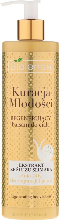Die Bielenda Youth Therapy Regenerating Body Lotion ist eine regenerierende Körperlotion, die mit Schneckenextrakt begeistert. Der hochwertige Inhaltsstoff sorgt für eine rasche Regeneration der Haut. Schnecken nutzen die heilende Wirkung ihres Schleims, um Wunden schnell wieder zu verschließen. Auch unsere Haut kann von dieser fantastischen Eigenschaft profitieren. Die Body Lotion zieht sehr schnell in die Haut ein und versorgt sie mit viel Feuchtigkeit. Nach dem Auftragen ist die Haut weich und fühlt sich glatter an. Die Body Lotion sorgt für eine Straffung der Haut und hilft bei einer schnelleren Regeneration. Wird die Lotion oft verwendet, wird die Haut nachhaltig straffer und glatter.