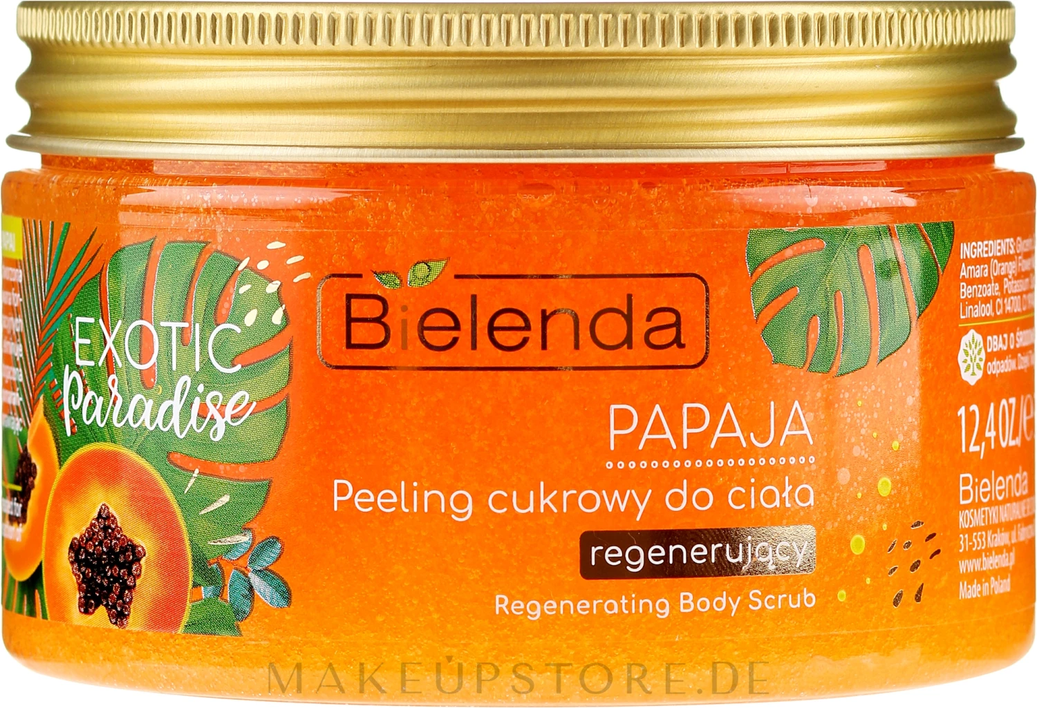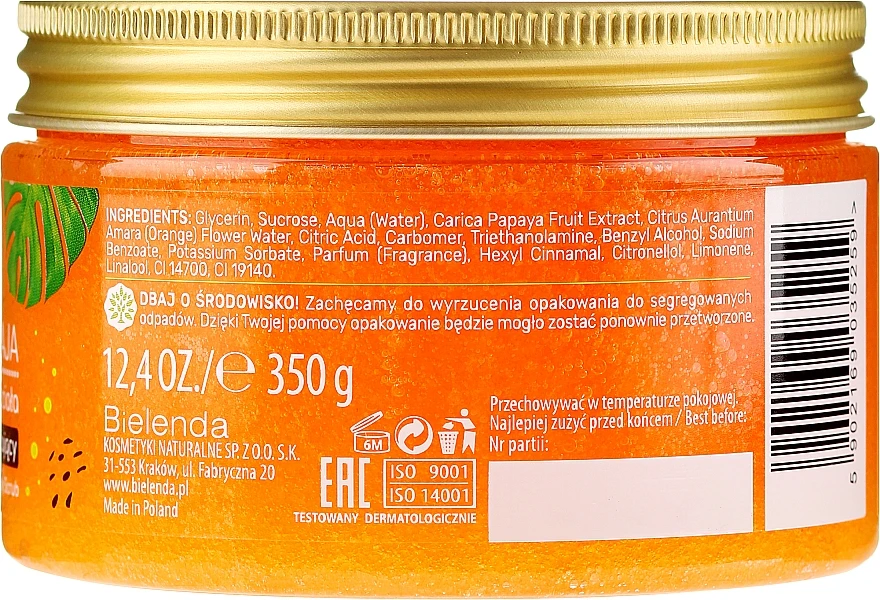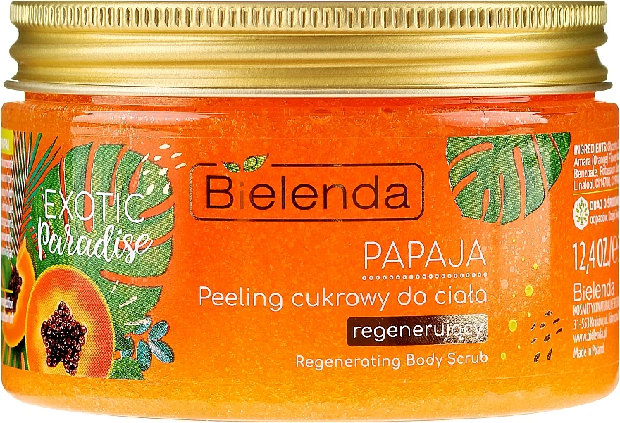 Das Bielenda Zuckerpeeling regeneriert und glättet Ihren Körper perfekt mit fruchtigem Papayaduft, der Ihre Sinne an einen tropischen Strand entführt. Der Formel sind feine Zuckerkristalle hinzugefügt, die sanft abgestorbene Zellen entfernen und die Poren reinigen. Ihre Haut fühlt sich sofort samtig weich und hydriert an. Regenerierendes Papaya-Fruchtextrakt und Orangensaft versorgen die Zellen mit Vitaminen und festigen das Gewebe.