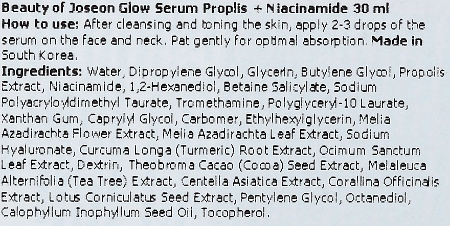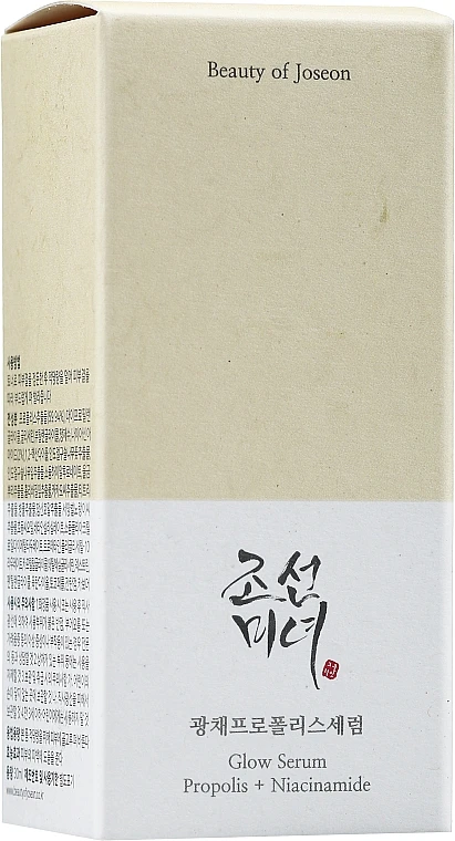 Die Experten des kosmetischen Unternehmens aus Südkorea Beauty Of Joseon haben das Geheimnis der perfekten Gesichtshaut entdeckt: das Glow Serum. Seine einzigartige Formel enthält 2% Niacinamid und 60% Propolis-Extrakt. Propolis verfügt über eine Vielzahl von Aminosäuren, Mikro- und Makroelementen, die die Haut nähren und mit einer extra Portion Energie auffüllen. Darüber hinaus enthält sein Extrakt antioxidativ wirkende Vitamine (A, C und E), die der Hautalterung vorbeugen und die Produktion von Elastin und Kollagen beschleunigen. Niacinamid wiederum hilft, Altersflecken und Rötungen zu reduzieren. Diese und andere ebenso nützliche Inhaltsstoffe sorgen dafür, dass Ihr Gesicht strahlend und gesund aussieht.