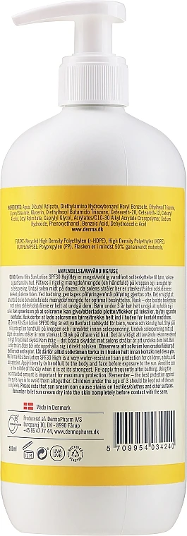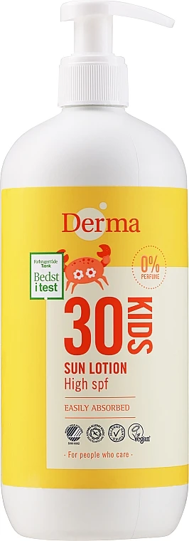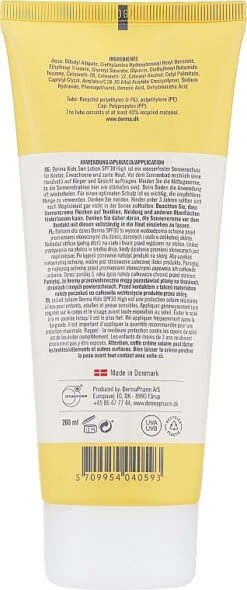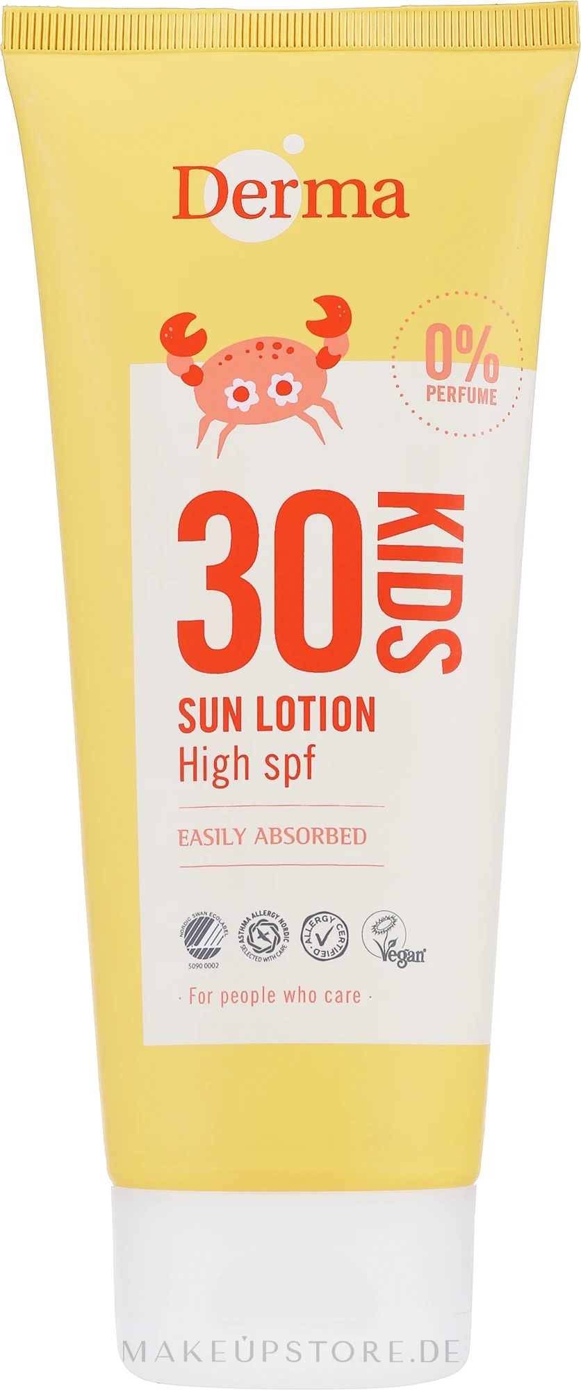 Sonne bedeutet Leben und Freude. Vor allem Kinder lieben es, bei Sommerwetter im Freien zu toben. Doch die zarte Kinderhaut ist sehr empfindlich und kann Schaden erleiden durch zu viel Sonnenstrahlung. Schützen Sie die Haut Ihres Kindes mit der Derma Sun Sonnenschutzlotion. Sie ist sehr gut verträglich, kommt ohne Parfüm- und Farbstoffe aus und enthält keine allergieauslösenden Substanzen. Mit einem hohen Lichtschutzfaktor von 30 schützt sie vor UVA und UVB Strahlen. Gleichzeitig enthält die Lotion pflegende Inhaltsstoffe, die die sensible Kinderhaut mit Feuchtigkeit versorgen und sie geschmeidig weich machen.