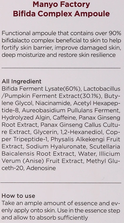 Bifida Complex Ampulle Bifidalacto Complex 90% der beliebten koreanischen Marke Manyo befeuchtet intensiv die Haut, beschleunigt die Prozesse der Regeneration und Erneuerung der Zellen der Epidermis, glättet den Hautton und gibt seine Ausstrahlung zurück. Das Serum hat einen ausgeprägten Anti-Aging-Effekt, strafft das Gesichtsoval, erhöht die Gewebeelastizität und beugt Hauterschlaffung vor. Als Basis des Produkts dient ein Komplex aus Lysat von Bifidobakterien (90%), der biologisch aktive Substanzen enthält, die durch Bio-Fragmentierung von Lysat von Bifidobakterien gewonnen werden. Das Produkt glättet die Falten perfekt und reduziert die Faltentiefe, gleicht Unregelmäßigkeiten im Gesicht aus und verhindert die Bildung neuer Falten.