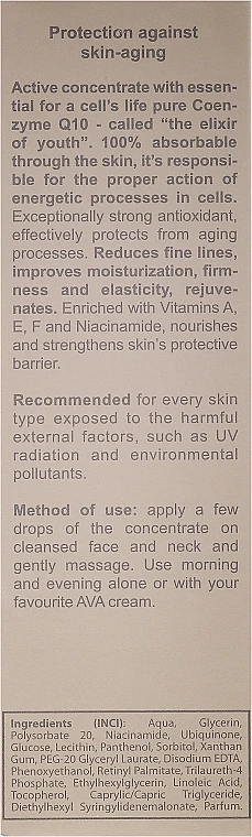 Das verjüngende und belebende Gesichtselixier mit Coenzym Q10 und Vitaminen von Ava Laboratorium ist für jeden Hauttyp geeignet. Es verjüngt die Haut nachhaltig und sorgt dafür, dass sie ein jugendliches Strahlen erhält. Tragen Sie das Elixier auf die gereinigte Haut auf und massieren Sie es einige Sekunden ein. Das Produkt zieht rasch ein und hinterlässt ein seidiges Gefühl sowie einen zarten Duft. Nutzen Sie das Gesichtselixier, um die Haut nachhaltig zu pflegen und verwenden Sie es bei Bedarf auch unter einem Make-up oder einer Creme. Vitamine und Coenzym Q10 pflegen die Haut, schenken Feuchtigkeit und sorgen dafür, dass sie sich schneller regenerieren kann.