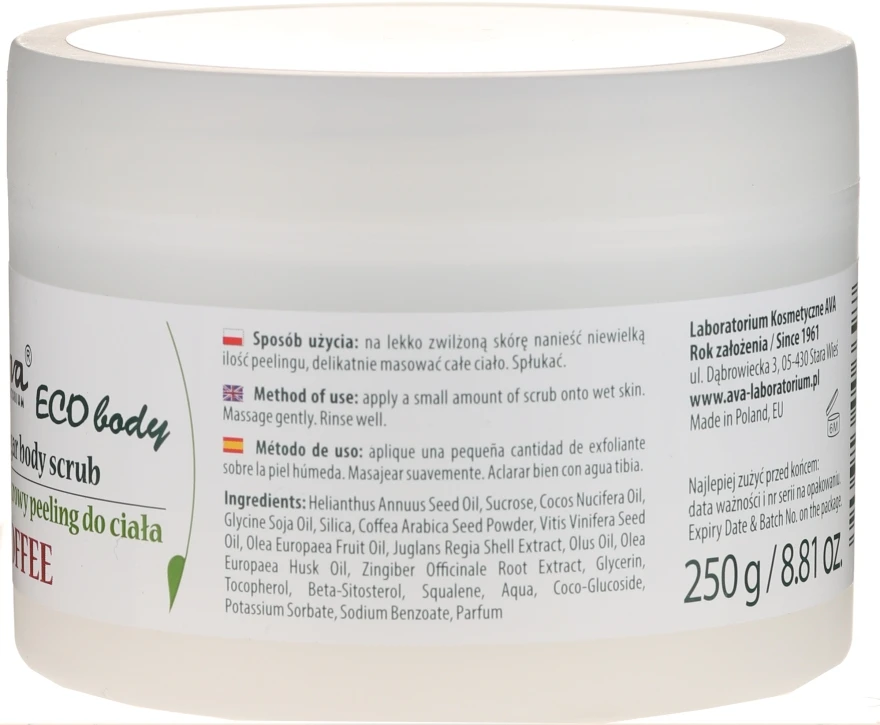 Das Zuckerpeeling für den Körper mit Kaffee von Ava Laboratorium verwöhnt die Haut mit hochwertigen Ölen und Kaffee. Das Produkt glättet die Haut nachhaltig und versorgt sie mit Feuchtigkeit. Es entfernt abgestorbene Zellen und lässt die Haut dadurch wieder ebenmäßig und glatt werden. Bei einer regelmäßigen Anwendung kann Cellulite bekämpft werden und die Haut wird insgesamt straffer. Tragen Sie das Peeling auf die feuchte Haut auf und massieren Sie es einige Minuten sanft ein. Warten Sie kurz und lassen Sie das Produkt einwirken. Waschen Sie es wieder ab und pflegen Sie die Haut mit einer entsprechenden Creme oder Lotion nach.